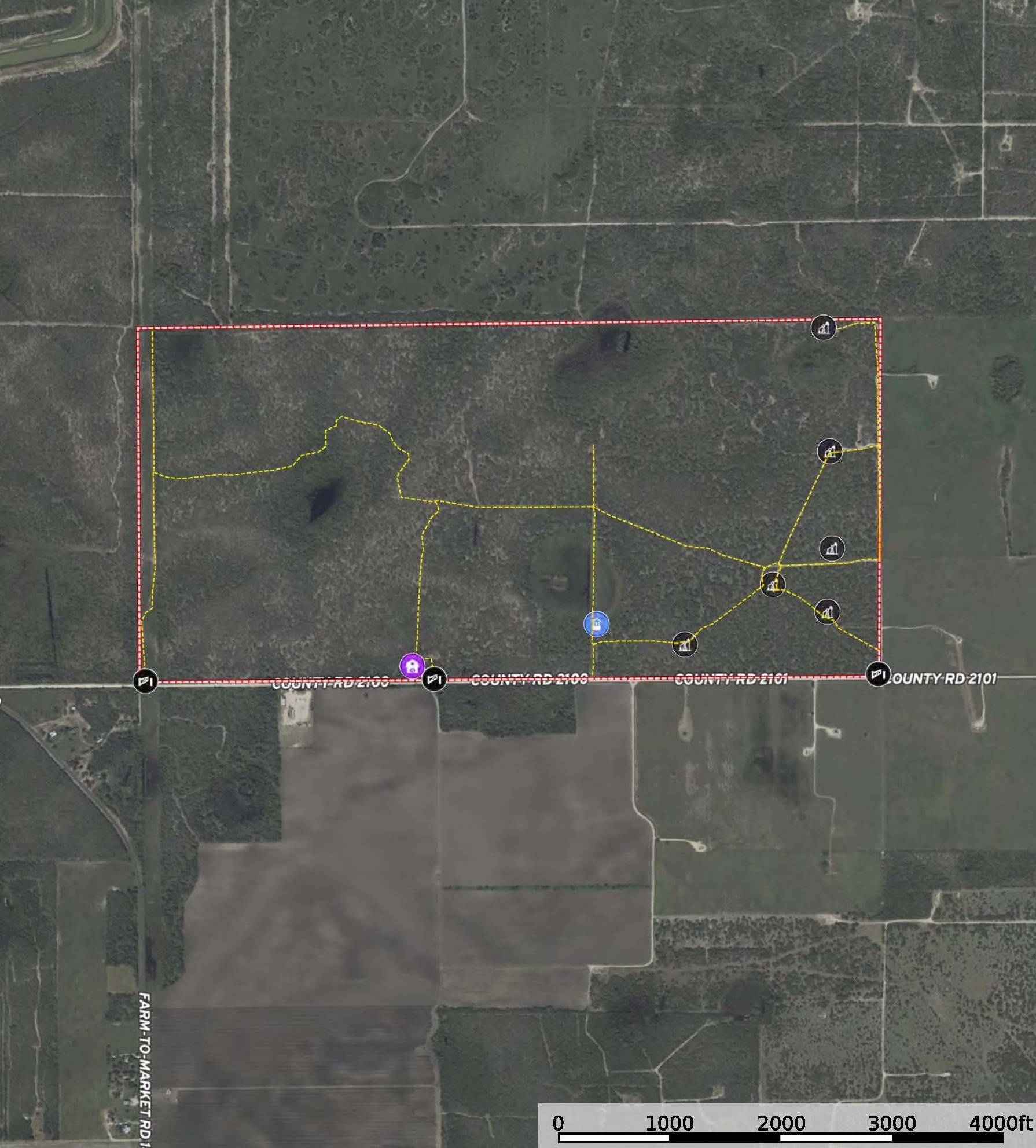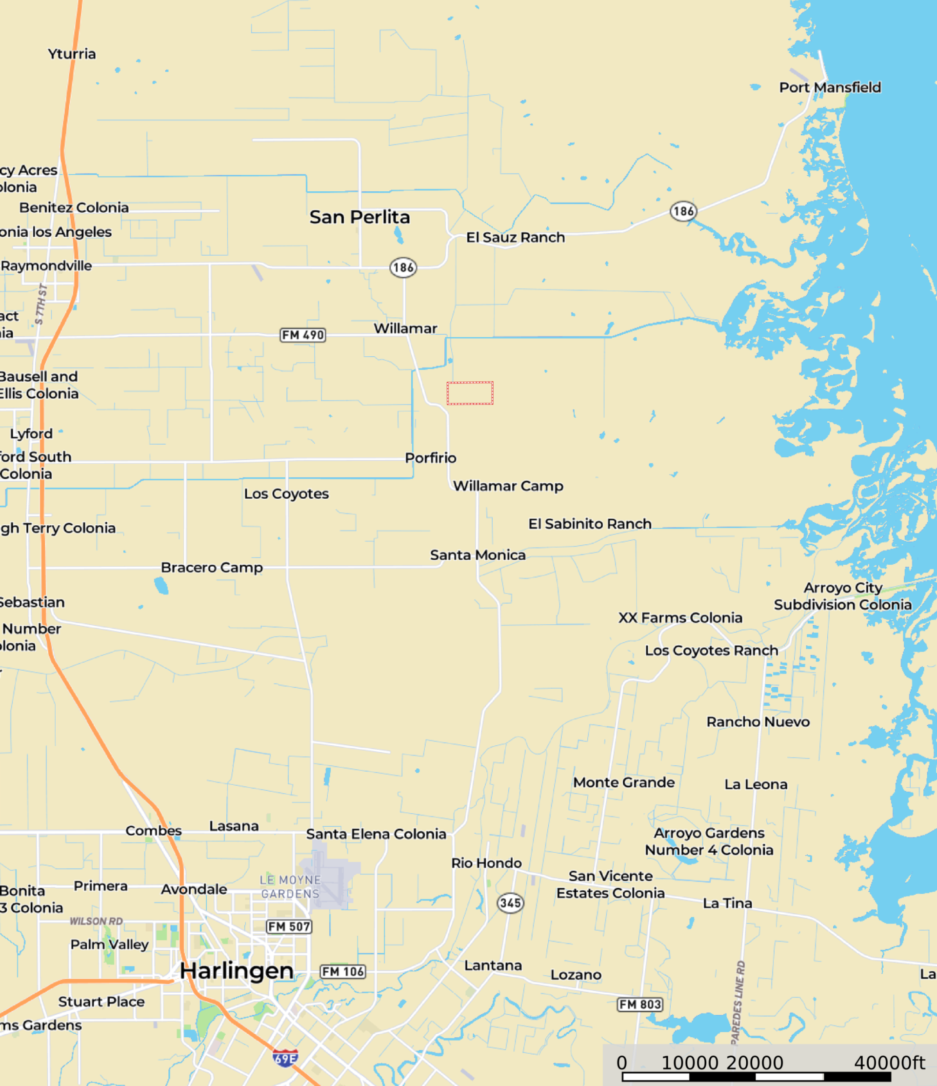 Rancho Zayas features approximately 1.3 miles of frontage along County Road 2100 (Zinnia Road), a county-maintained caliche road, with four gated access points providing excellent ingress and egress. The ranch is rectangular in shape, allowing for efficient management and future improvements. Its location—just 11 miles east of Lyford, midway between Santa Monica and Willamar, less than 15 miles north of Harlingen International Airport and less than 20 miles from Port Mansfield—offers outstanding convenience while maintaining seclusion. Harlingen is within a 20-minute drive.